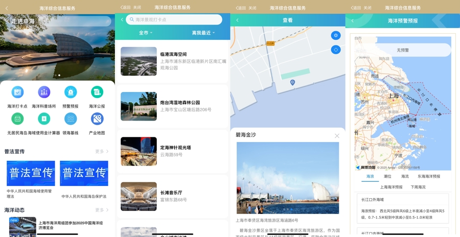 相应地,“走进申海”精心设计了相关内容。在服务市民朋友方面,“走进申海”为市民精心挑选的16个亲海打卡点,遍布浦东、宝山、金山、奉贤、崇明等地,其中既有崇明东滩、临港滨海空间、金山鹦鹉洲湿地等景色亮丽的亲海空间,也有金山城市沙滩、奉贤碧海金沙等海边游玩场所,还包括多个适合拍照打卡的优选位置;为帮助市民朋友更好了解海洋历史、认知海洋文化、关注海洋生态,“走进申海”还为市民朋友精心推荐了6个海洋科普场所;为方便市民朋友了解海洋预警报信息,在更安全亲海,“走进申海”还开设了海洋预警预报信息栏目,及时提供准确的海洋预警预报信息。